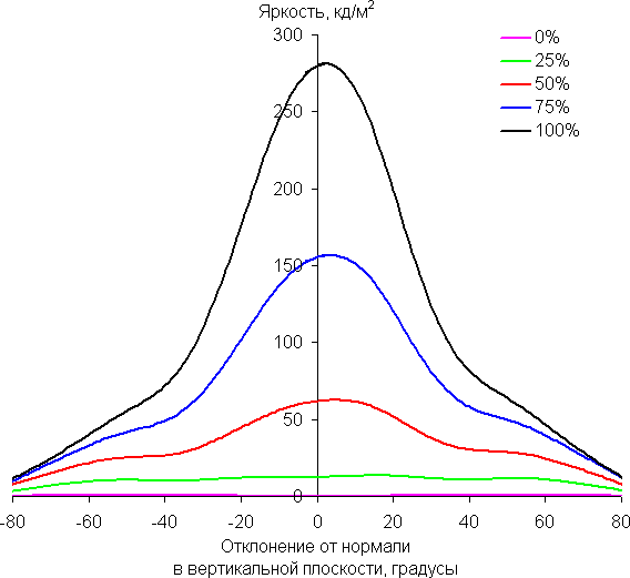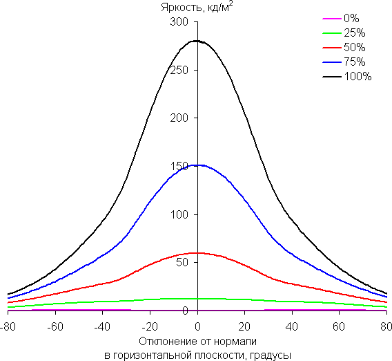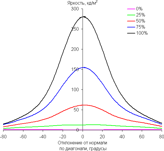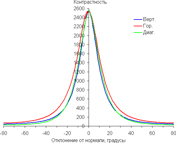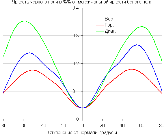 По скорости падения яркости углы обзора неширокие. Отметим примерно одинаковый характер уменьшения яркости при отклонении от перпендикуляра к экрану во всех трех направлениях, при этом графики не пересекаются в значимом диапазоне измеряемых углов. При отклонении в диагональном направлении яркость черного поля достигает большего значения, чем в двух других случаях. Однако максимум яркости черного поля всё равно гораздо меньше, чем в случае типичного монитора на матрице IPS. Контрастность в диапазоне углов ±82° остается существенно выше значения 10:1.