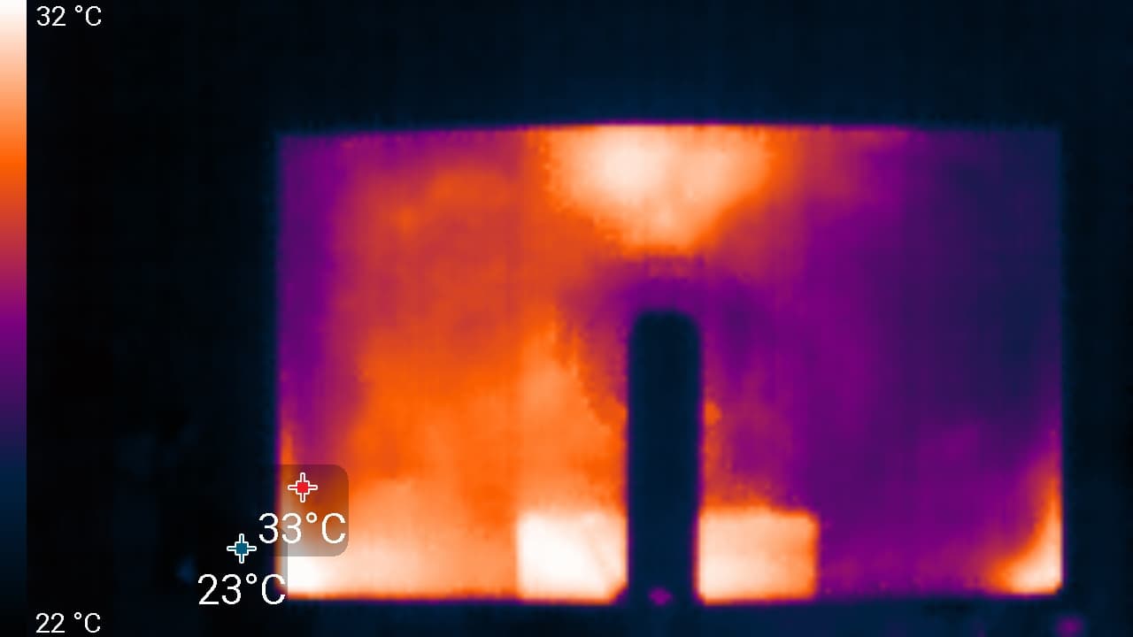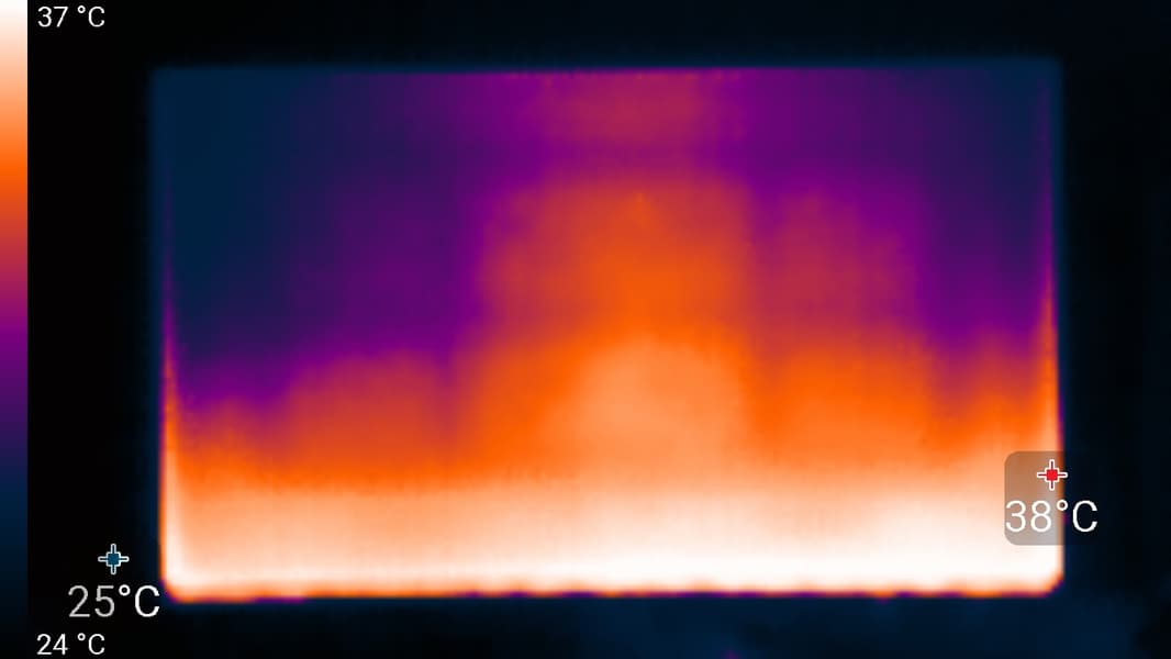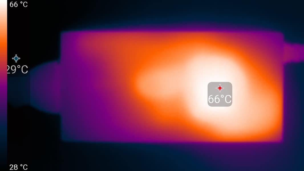 По распределению областей нагрева, можно предположить, что внизу находится светодиодная линейка подсветки экрана. Нагрев сзади умеренный. Корпус БП нагрелся до 66 °C, что очень много: