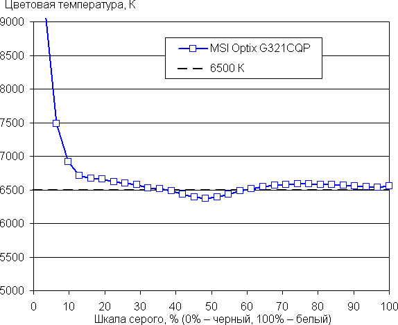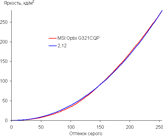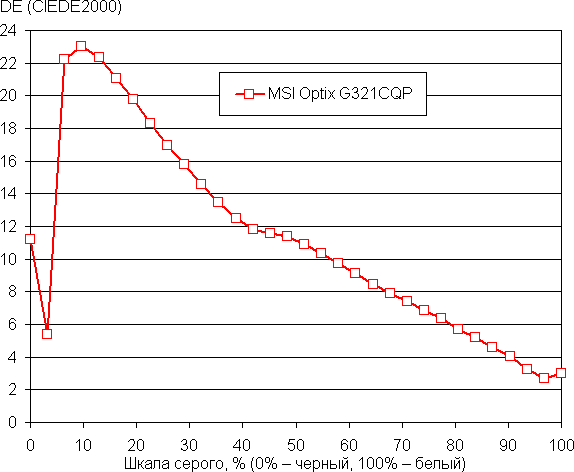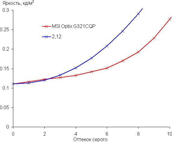 На большей части шкалы серого рост прироста яркости весьма равномерный, и каждый следующий оттенок ярче предыдущего. В тенях все оттенки визуально отличаются по яркости, что для игрового монитора очень полезно: