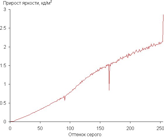 Для оценки характера роста яркости на шкале серого мы измерили яркость 256 оттенков серого (от 0, 0, 0 до 255, 255, 255). График ниже показывает прирост (не абсолютное значение!) яркости между соседними полутонами: