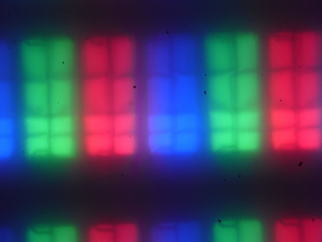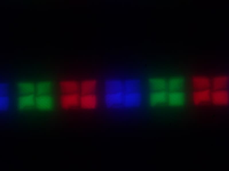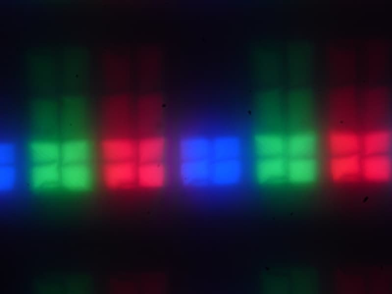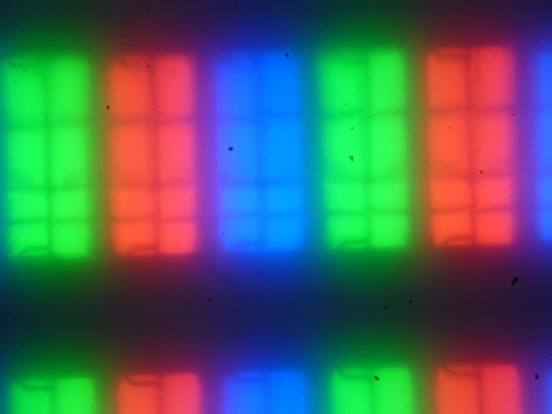 Четкое изображение структуры пикселей из-за матовой поверхности получить не удается, впрочем, на фрагменте ниже можно разглядеть типичную для VA структуру (черные точки — это пыль на матрице фотоаппарата):