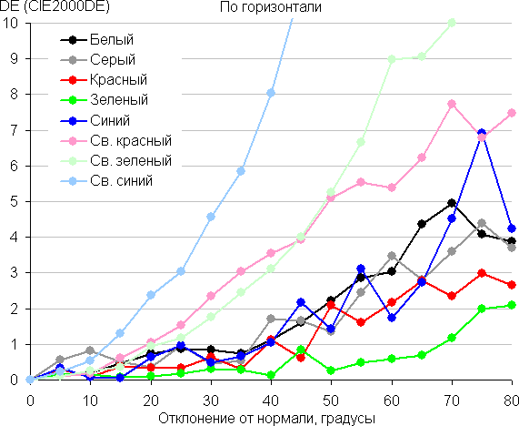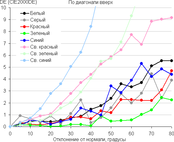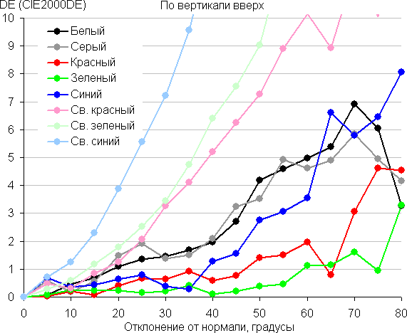 Для количественной характеристики изменения цветопередачи мы провели колориметрические измерения для белого, серого (127, 127, 127), красного, зеленого и синего, а также светло-красного, светло-зеленого и светло-синего полей во весь экран с использованием установки, подобной той, что применялась в предыдущем тесте. Измерения проводились в диапазоне углов от 0° (датчик направлен перпендикулярно к экрану) до 80° с шагом в 5°. Полученные значения интенсивностей были пересчитаны в ΔE относительно замера каждого поля при перпендикулярном положении датчика относительно экрана. Результаты представлены ниже: