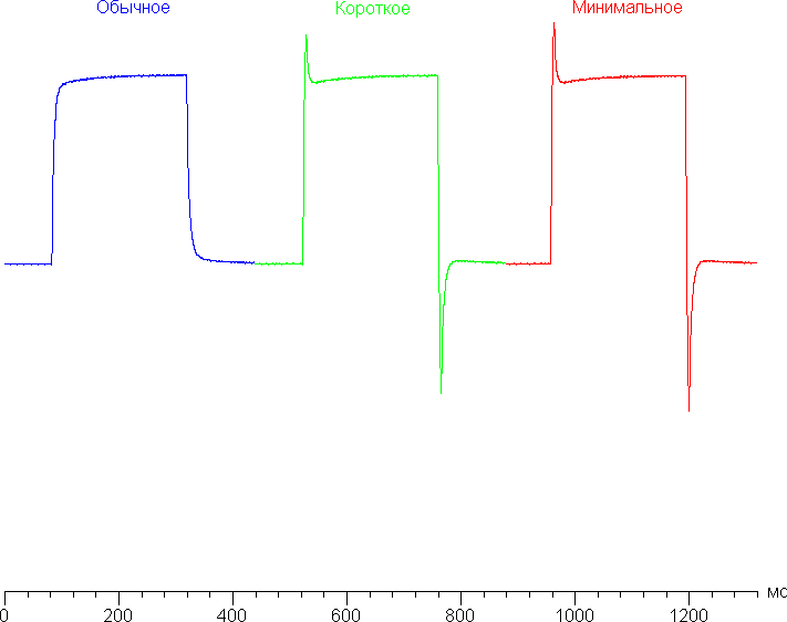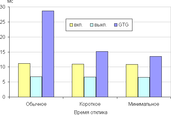 Время отклика зависит от значения одноименной настройки, которая управляет разгоном матрицы. График ниже показывает, как меняется время включения и выключения при переходе черный-белый-черный (столбики «вкл.» и «выкл.»), а также среднее суммарное время для переходов между полутонами (столбики «GTG») для трех значений этой настройки при частоте обновления 165 Гц: