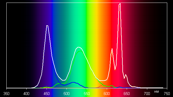 Ниже приведен спектр для белого поля (белая линия), наложенный на спектры красного, зеленого и синего полей (линии соответствующих цветов):