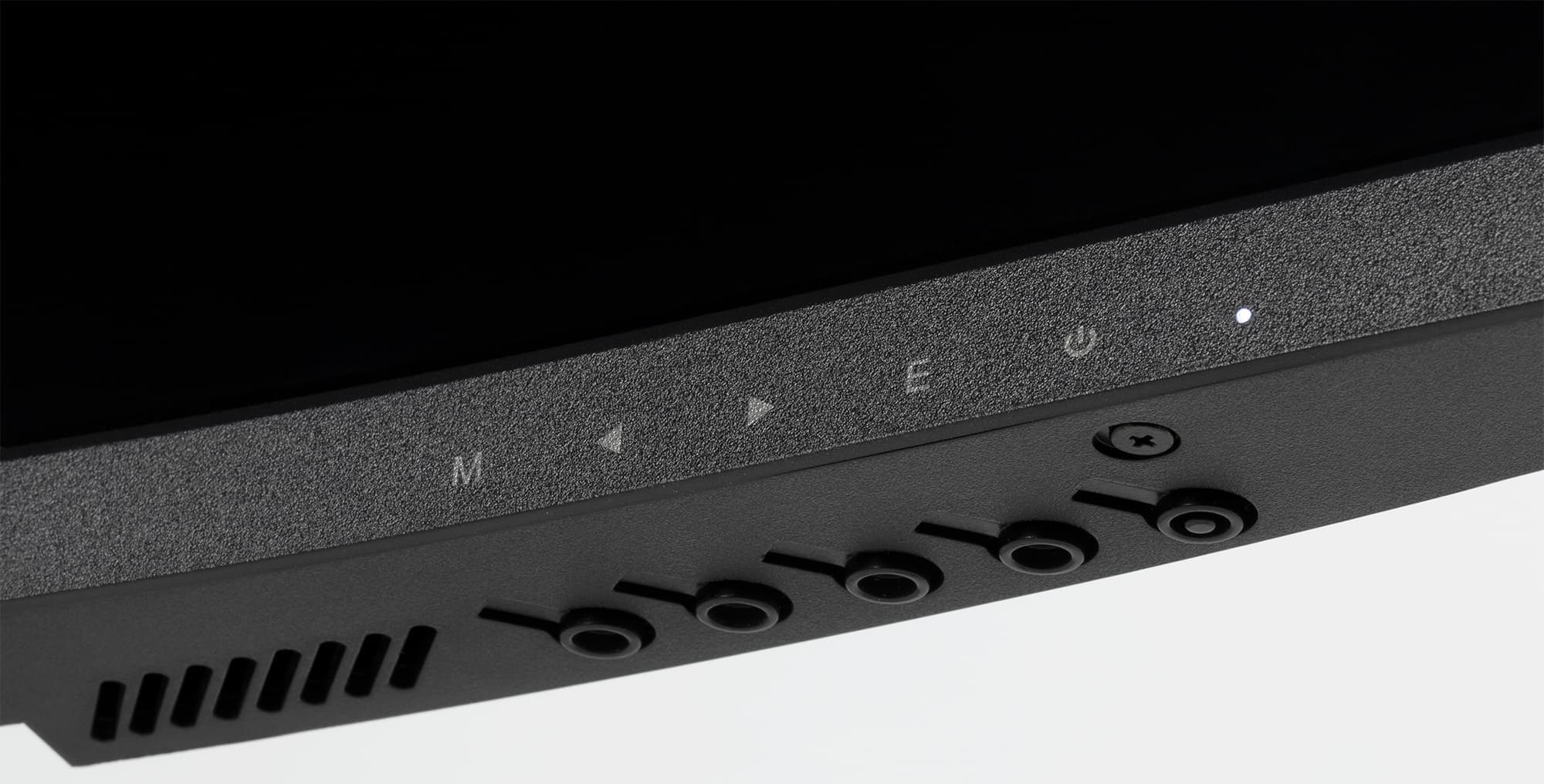 Правее меток есть крохотный светорассеиватель индикатора состояния. Индикатор неярко светится белым при работе, оранжевым — в режиме ожидания, и не горит, если монитор условно выключен.