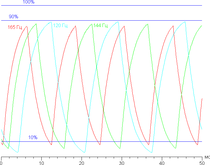 Приведем зависимости яркости (вертикальная ось) от времени (горизонтальная ось) при чередовании белого и черного кадра при 165, 144 и 120 Гц кадровой частоты: