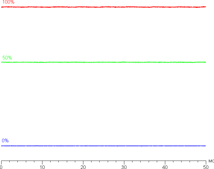 На любом уровне яркости модуляция подсветки отсутствует, что исключает видимое мерцание экрана. Для тех, кто привык распознавать знакомое сокращение, уточним: ШИМ отсутствует. В доказательство приведем графики зависимости яркости (вертикальная ось) от времени (горизонтальная ось) при различных значениях настройки яркости: