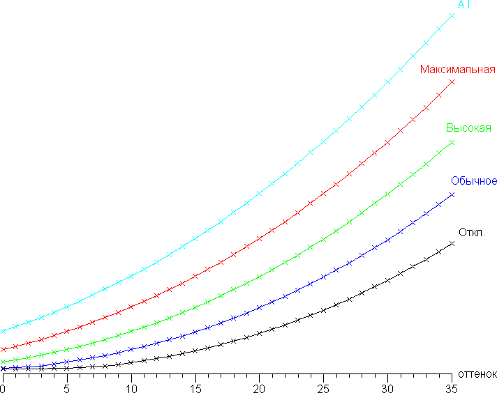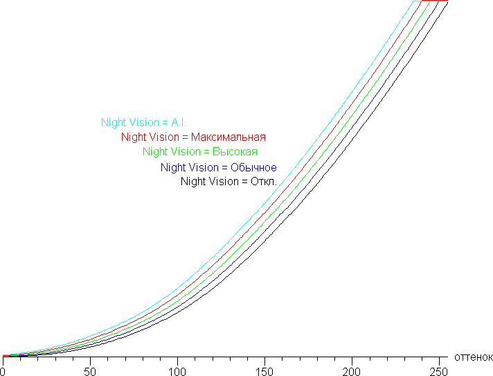Дополнительной настройкой Night Vision (три уровня плюс автоматический) можно скорректировать гамма-кривую, улучшая различимость деталей в тенях. Это может быть полезно в играх с темными сценами. Ниже приведены гамма-кривые при четырех значениях этой настройки и когда эта функция отключена: