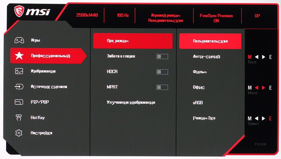Можно выбрать один из четырех предустановленных профилей с заданными «игровыми» настройками и одновременно с этим один из пяти с «профессиональными» настройками изображения. В обоих списках профилей есть еще по одному пользовательскому профилю. Все профили являются редактируемыми.