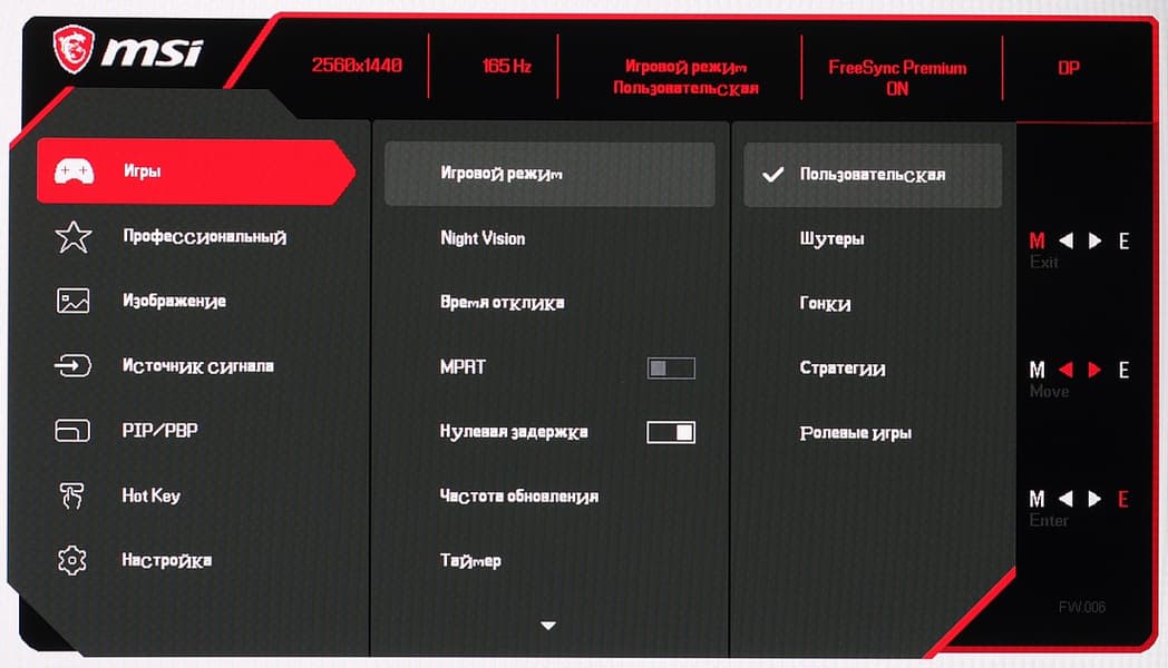 Только при подключении к компьютеру по DisplayPort поддерживается разрешение до 2560×1440 при 165 Гц кадровой частоты при сигнале 10 бит на цвет на вход и без потери цветовой четкости. При подключении по HDMI в разрешении 2560×1440 можно получить максимум 144 Гц кадровой частоты при сигнале 8 бит на цвет. Отметим, что при подключении по DisplayPort и по HDMI на вход поддерживается сигнал до 4К@60p (3840×2160), а также 1080@120p, что обеспечивает лучшую совместимость с приставками (игровыми консолями). В режиме 4К@24p вариации длительности кадров нет, поэтому этот режим можно использовать для просмотра кинофильмов.