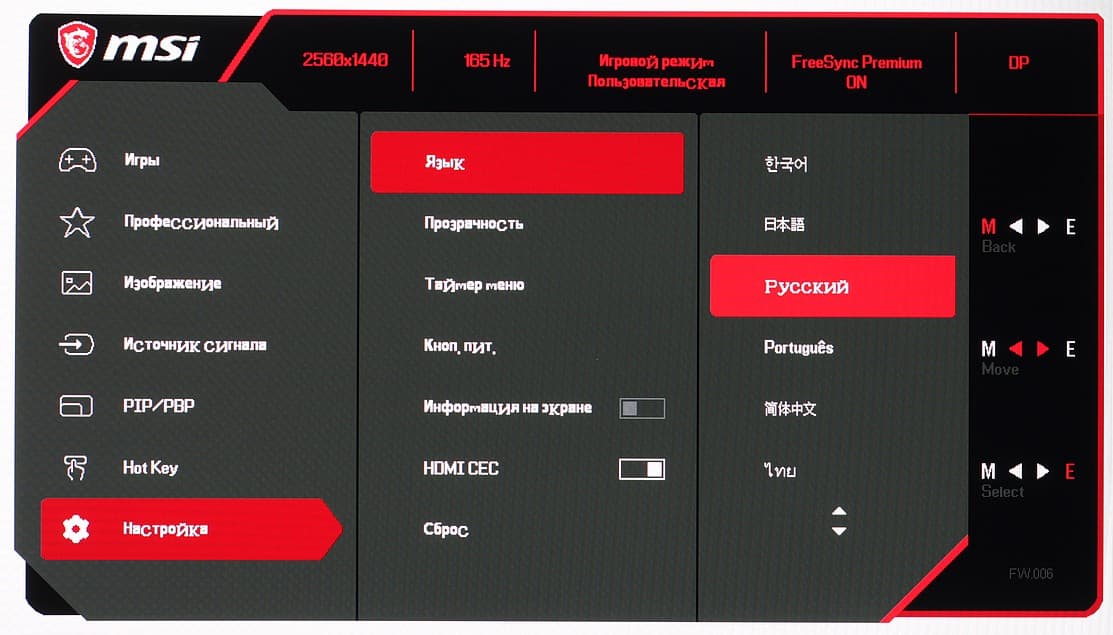 Настраиваются уровень прозрачности фона и задержка автоматического выхода из меню. Присутствует русская версия экранного меню.
