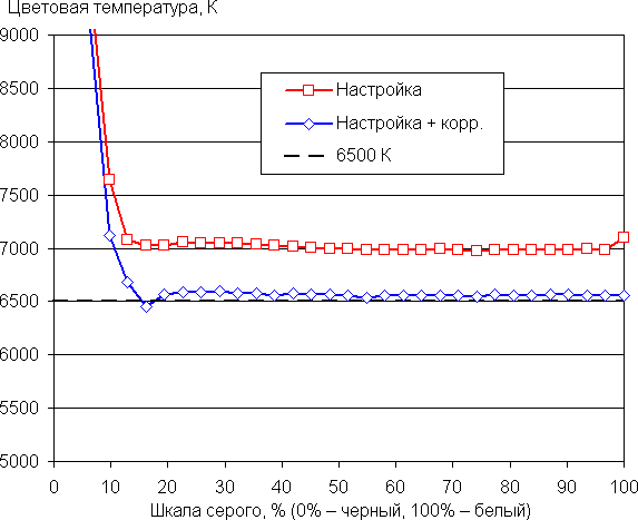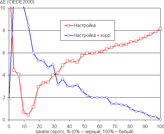 Самый близкий к черному диапазон можно не учитывать, так как в нем цветопередача не так важна, а погрешность измерения цветовых характеристик высокая. Ручная коррекция приблизила цветовую температуру к 6500 К, а заодно и в среднем уменьшила значение ΔE. Впрочем, для игрового применения особой необходимости в коррекции нет.