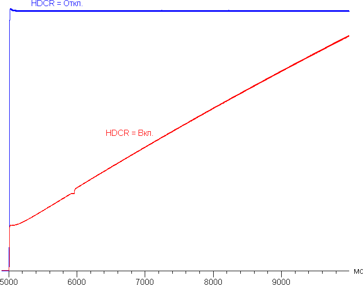 При включении режима с динамическим управлением яркости установившаяся контрастность формально возрастает до бесконечности, так как на черном поле во весь экран подсветка выключается совсем через 11 секунд. Впрочем, уже курсора мыши достаточно для включения подсветки. График ниже показывает, как увеличивается яркость (вертикальная ось) при переключении с черного поля (после пяти секунд вывода) на белое при выключенной и включенной динамической подстройке яркости: