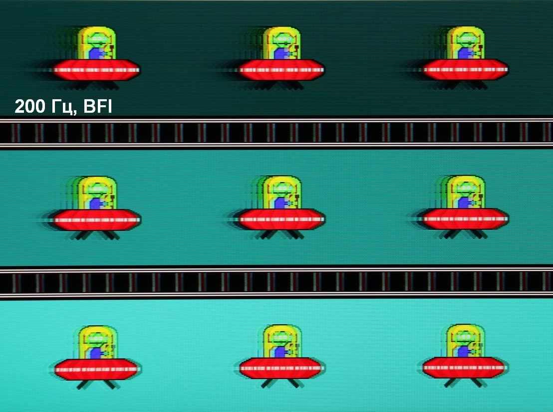Есть режим со вставкой черного кадра (правда истинно черным он в данном случае не является) с названием Уменьш. смазывания. Зависимости яркости (вертикальная ось) от времени (горизонтальная ось) для выключенного и включенного режима (частота обновления 200 Гц):