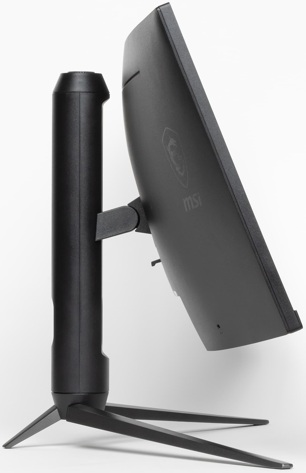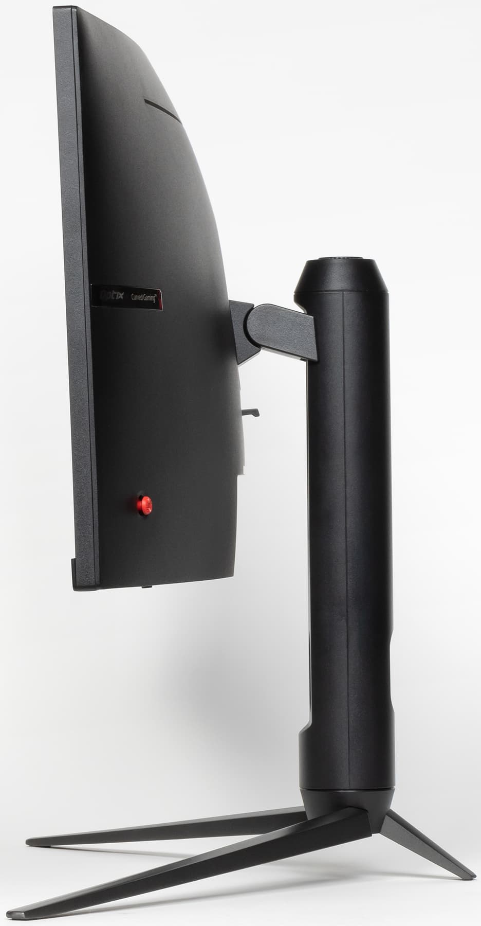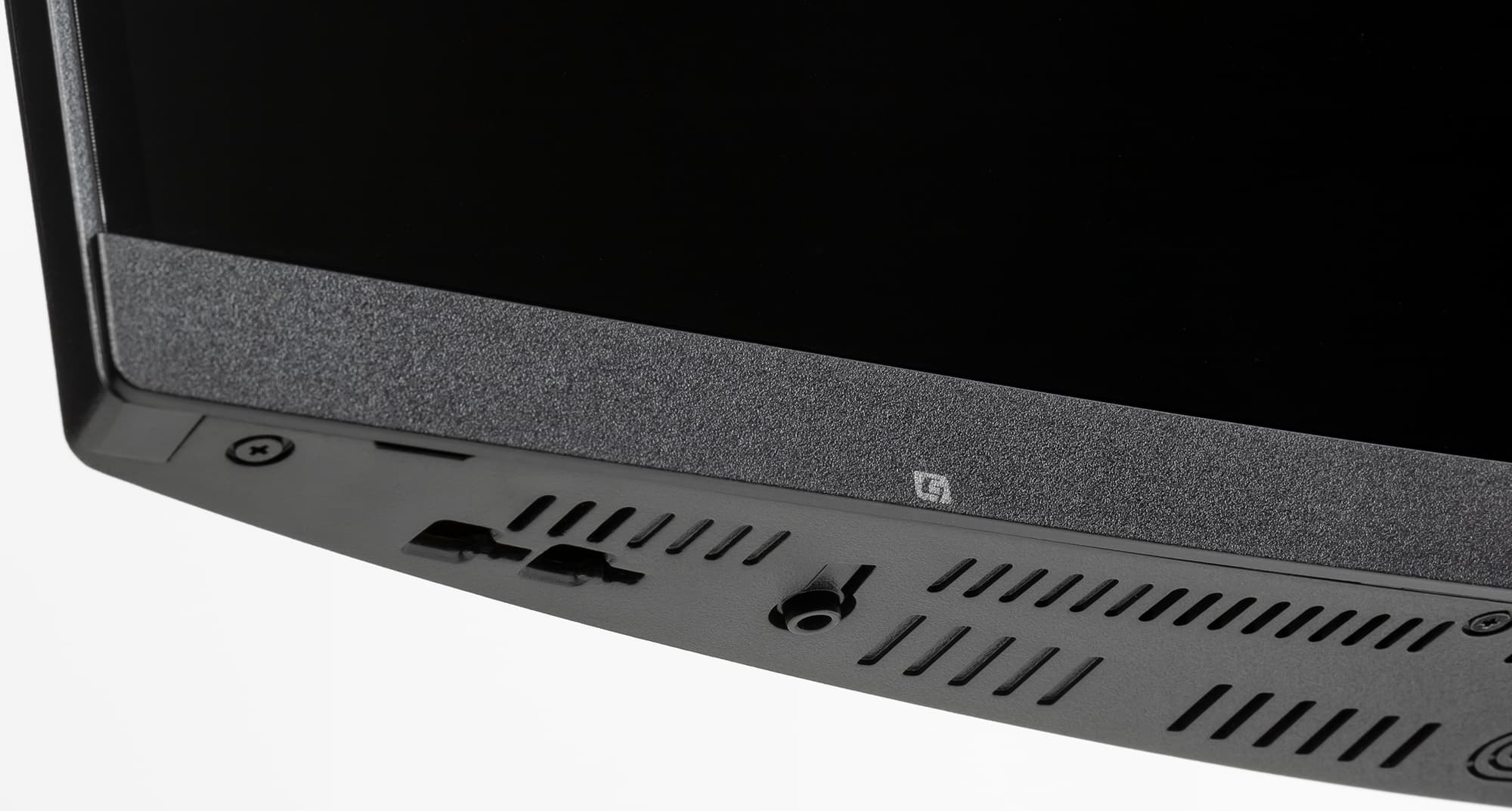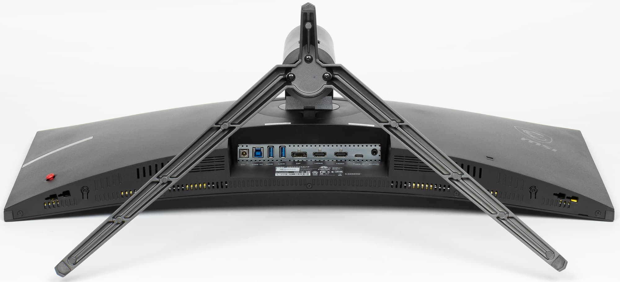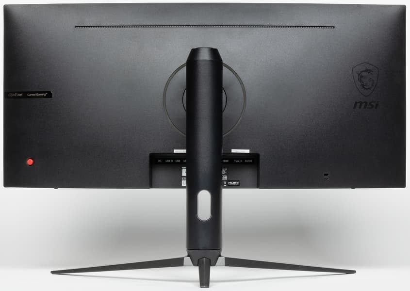 Дизайн сдержанно игровой. Внешние элементы блока экрана, стойки и узла крепления блока экрана изготовлены из черного пластика с матовой поверхностью. Ориентацию на игроков выдают трехпалое основание подставки, изготовленное из алюминиевого сплава и имеющее стойкое матовое темно-темно-серо-серебристое покрытие, шильдик на задней панели с надписью Optix Curved Gaming, а также красный цвет джойстика. Внешняя поверхность матрицы черная, полуматовая (зеркальность хорошо выражена), внешний слой матрицы жесткий. Плоскость экрана изогнута по цилиндру так, что правый и левый край немного выдвинуты вперед. Заявленный радиус изгиба равен 1,5 м. Равномерность кривизны экрана у данной модели хорошая, правда в вертикальной полосе шириной порядка 10-15 см у правого и левого края экран практически плоский, но это характерно для всех изогнутых ЖК-экранов. Спереди экран выглядит как монолитная поверхность, ограниченная снизу неширокой планкой, а по периметру — узкой окантовкой. Выведя изображение на экран, можно увидеть, что на самом деле между внешними границами экрана и собственно областью отображения есть неширокие поля.