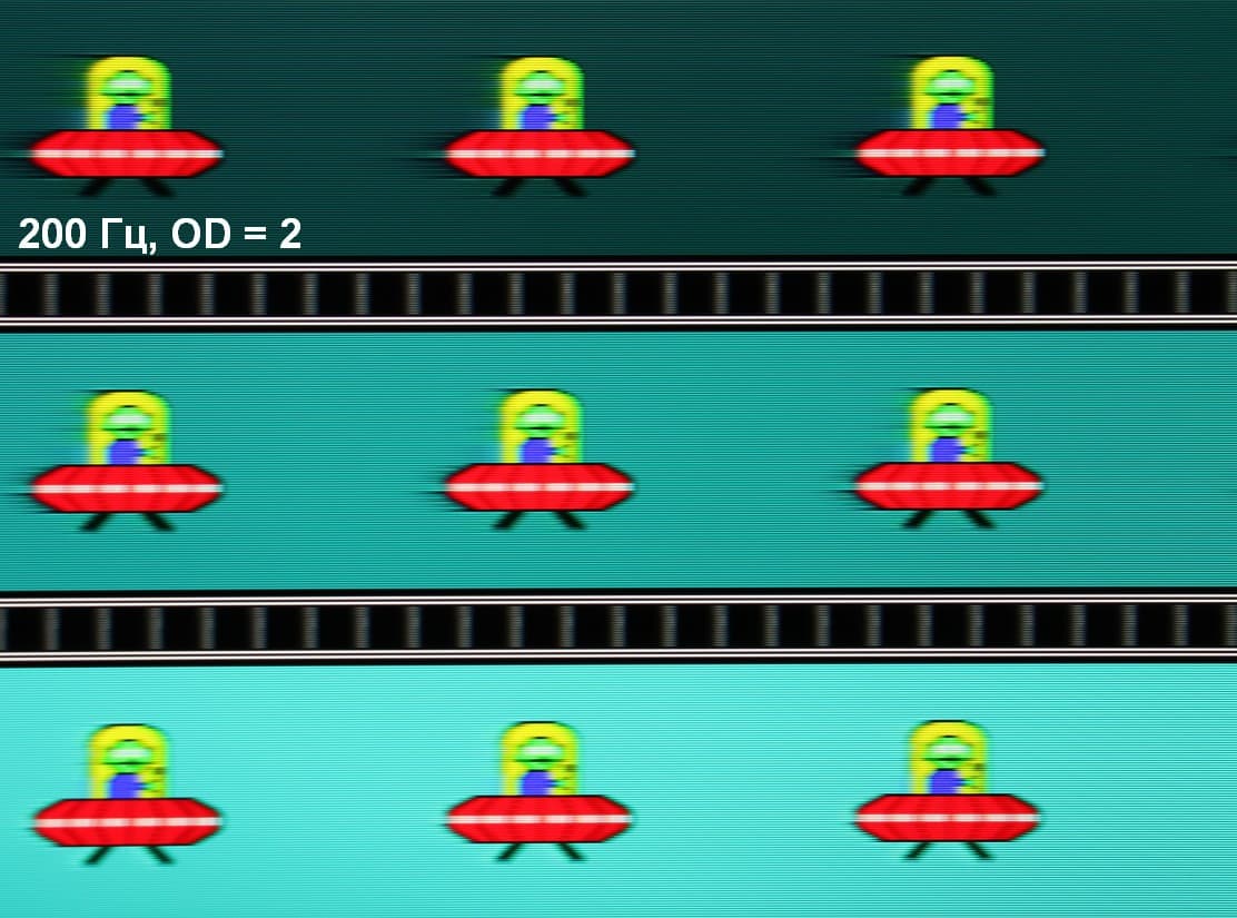 Видно, что на минимальном разгоне максимальная яркость белого кадра ниже уровня 90% от белого, а минимальная яркость черного кадра опускается не сильно ниже 10%. Амплитуда изменения яркости немного ниже 80% от уровня белого. Однако уже на второй ступени разгона амплитуда выше 80%, то есть согласно этому формальному критерию скорости матрицы после разгона достаточно для вывода изображения с кадровой частотой 200 Гц.