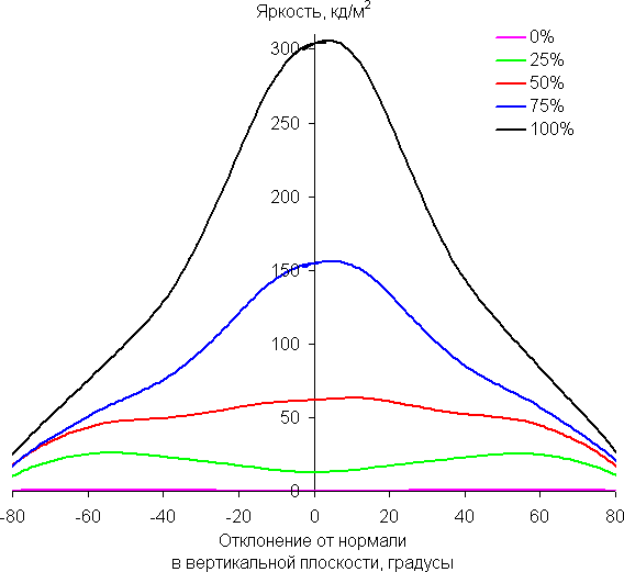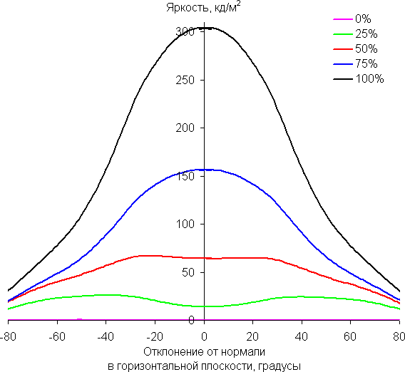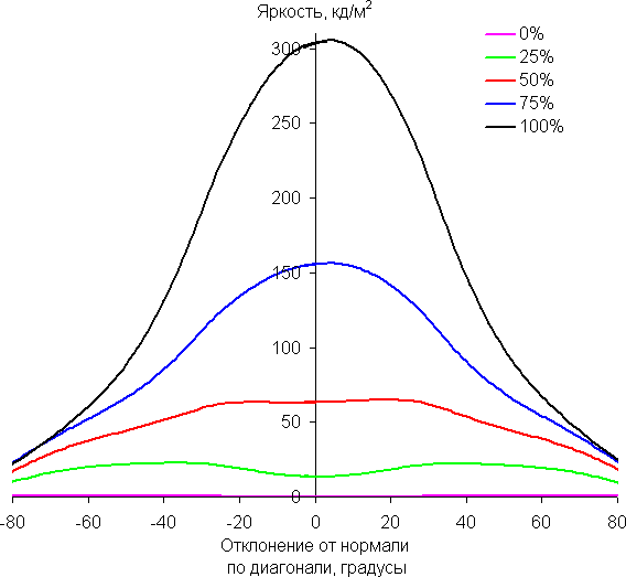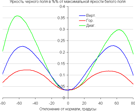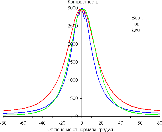 По скорости падения яркости углы обзора неширокие. Отметим примерно одинаковый характер уменьшения яркости при отклонении от перпендикуляра к экрану во всех трех направлениях, при этом графики не пересекаются в значимом диапазоне измеряемых углов. При отклонении в диагональном направлении яркость черного поля достигает большего значения, чем в двух других случаях. Однако максимум яркости черного поля все равно гораздо меньше, чем в случае типичного монитора на матрице IPS. Контрастность в диапазоне углов ±82° остается существенно выше значения 10:1.