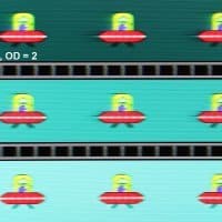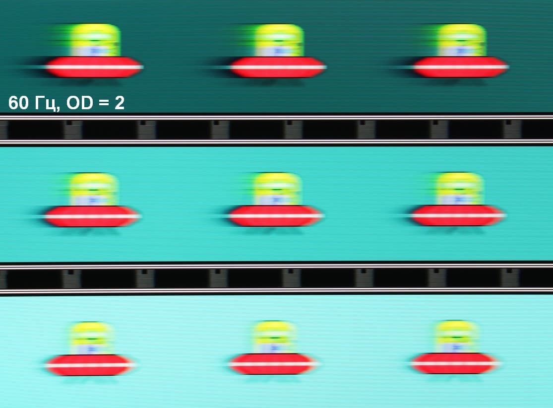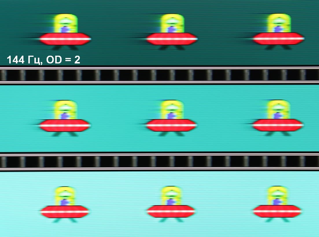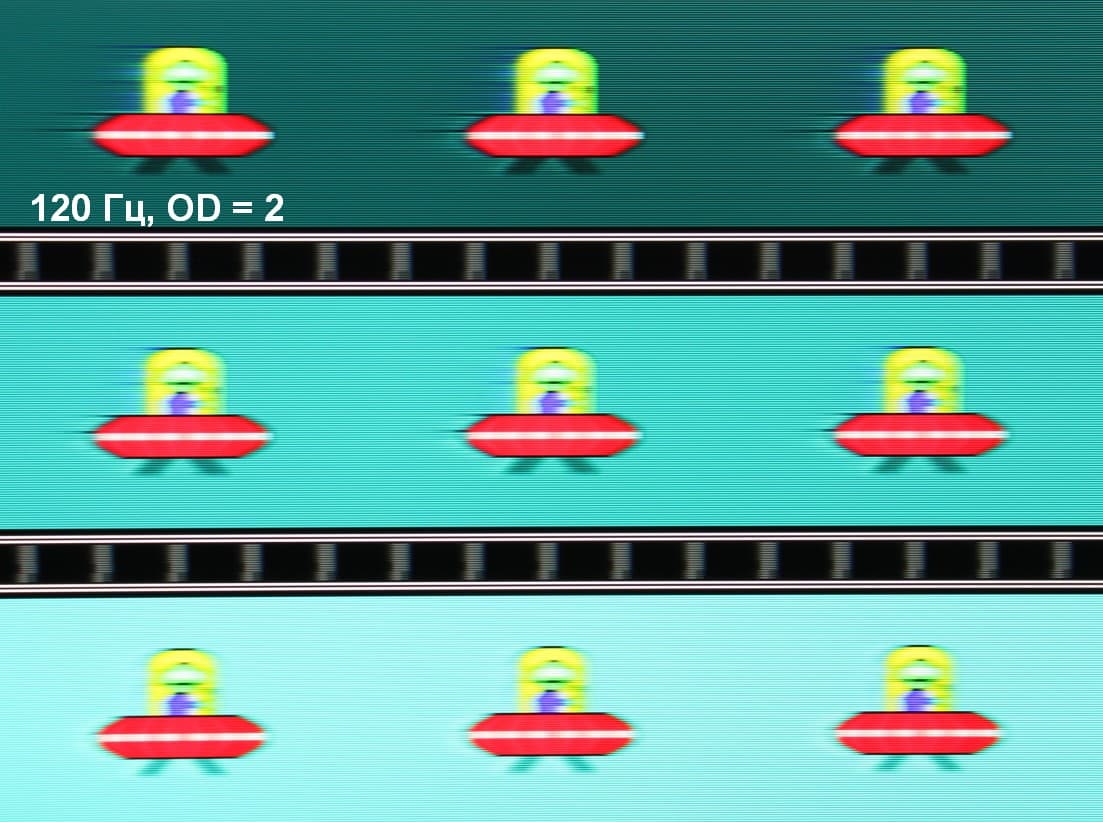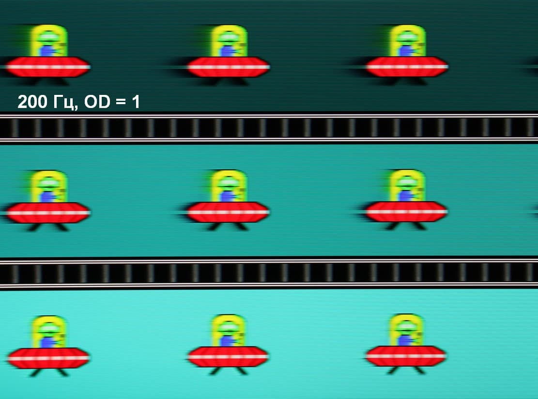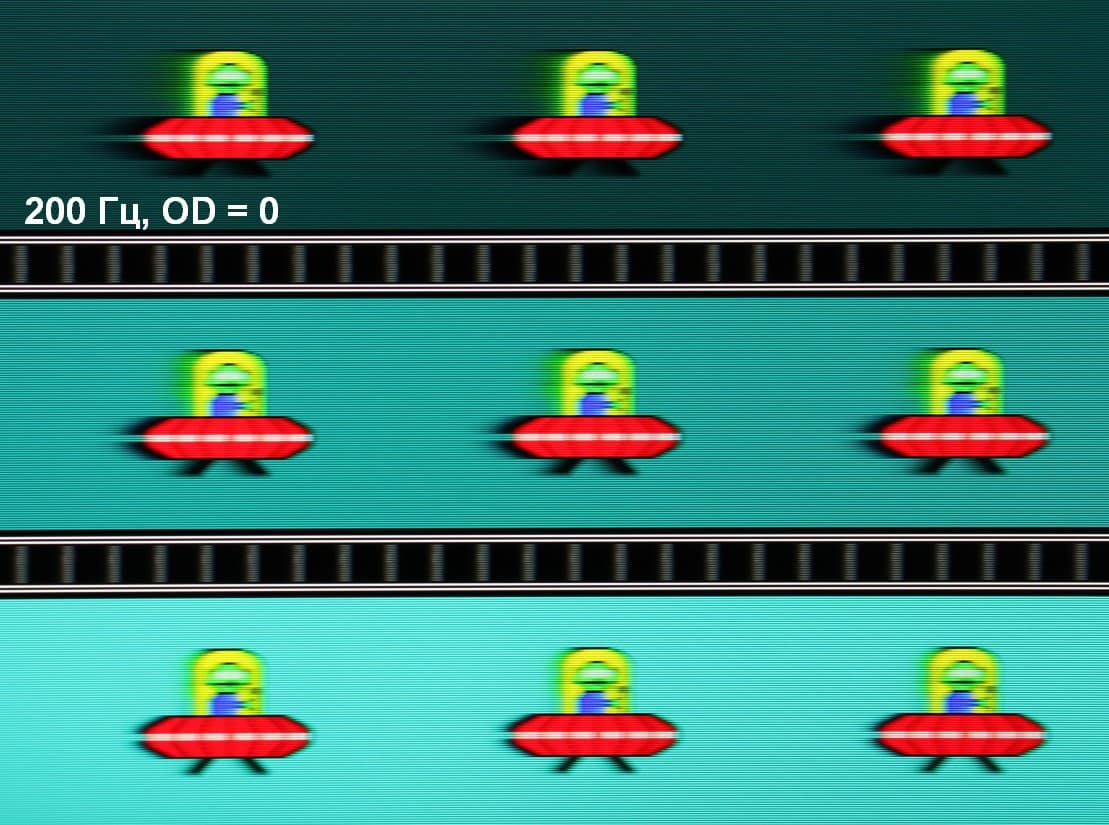 Для наглядного представления о том, что на практике означает такая скорость матрицы, и какие могут быть артефакты от разгона, приведем серию снимков, полученных с помощью движущейся камеры. Такие снимки показывают, что видит человек, если он следит глазами за двигающимся на экране объектом. Описание теста приведено тут, страница с самим тестом тут. Отметим, что получить хорошие по качеству снимки в этом тесте в случае изогнутого монитора сложно. Использовались рекомендованные установки (скорость движения 960, 1000 или 1008 пиксель/с, то есть на целое число пикселей за кадр), выдержка 1/15 с, на фотографиях указаны значения частоты обновления, а также ступень разгона (сокращено до OD — от Overdrive) и включена ли функция вставки черного кадра (BFI).