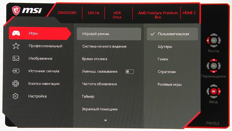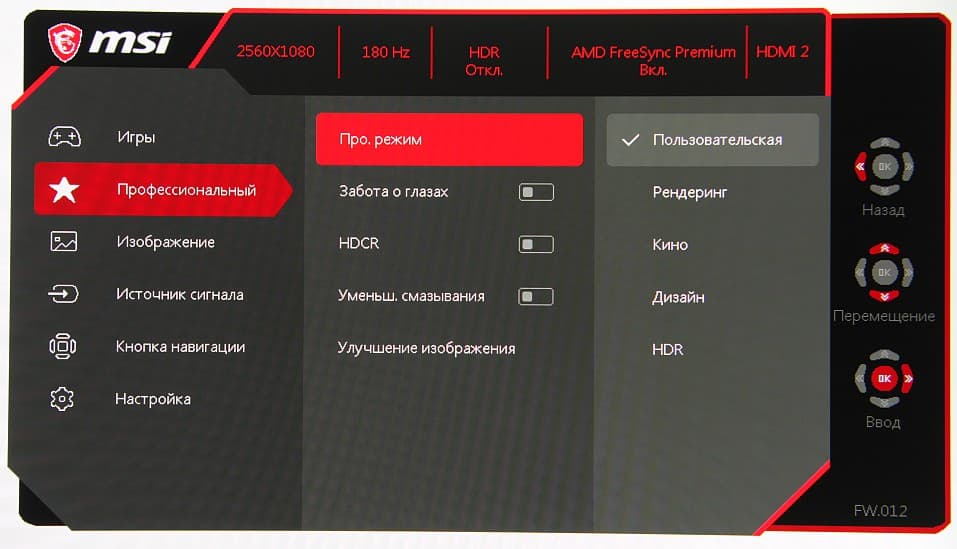 Можно корректировать цветовой баланс выбором цветового профиля из трех предустановленных или пользовательского, в котором цветовой баланс можно подправить регулировками интенсивности трех основных цветов. Можно выбрать один из четырех предустановленных профилей с заданными «игровыми» настройками и одновременно с этим один из четырех с «профессиональными» настройками изображения. В обоих списках профилей есть еще по одному пользовательскому профилю. Все профили являются редактируемыми.