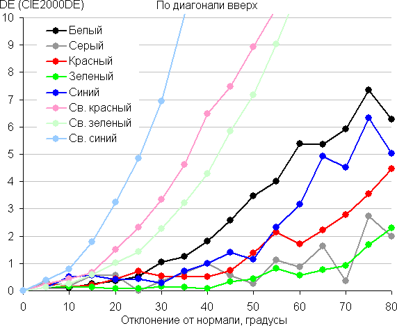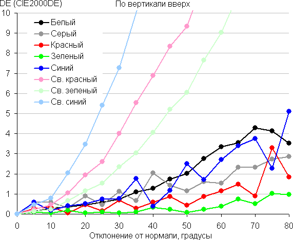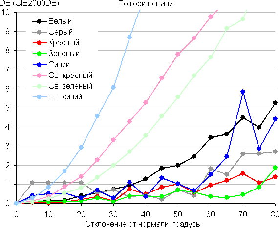 Для количественной характеристики изменения цветопередачи мы провели колориметрические измерения для белого, серого (127, 127, 127), красного, зеленого и синего, а также светло-красного, светло-зеленого и светло-синего полей во весь экран с использованием установки, подобной той, что применялась в предыдущем тесте. Измерения проводились в диапазоне углов от 0° (датчик направлен перпендикулярно к экрану) до 80° с шагом в 5°. Полученные значения интенсивностей были пересчитаны в ΔE относительно замера каждого поля при перпендикулярном положении датчика относительно экрана. Результаты представлены ниже: