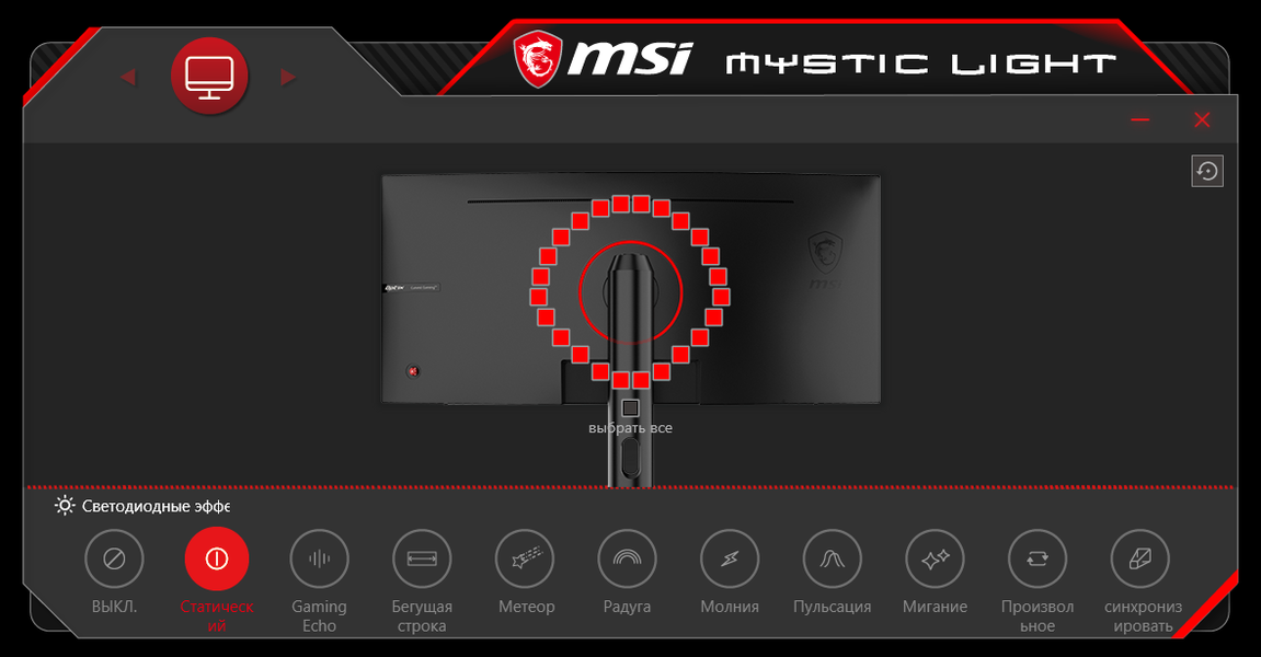 В меню монитора подсветку можно включить (динамичный режим) или выключить. Больше вариантов работы подсветки доступно, если воспользоваться утилитой Mystic Light, которая запускается из программы Gaming OSD.