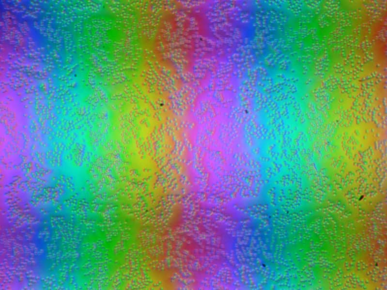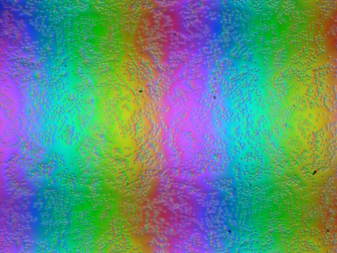 Зерно этих дефектов в несколько раз меньше размеров субпикселей, поэтому фокусировка на микродефектах и «перескок» фокуса по субпикселям при изменении угла зрения выражены слабо, из-за этого нет и «кристаллического» эффекта.