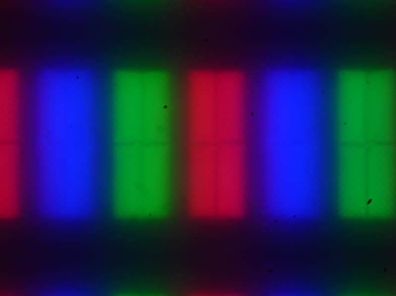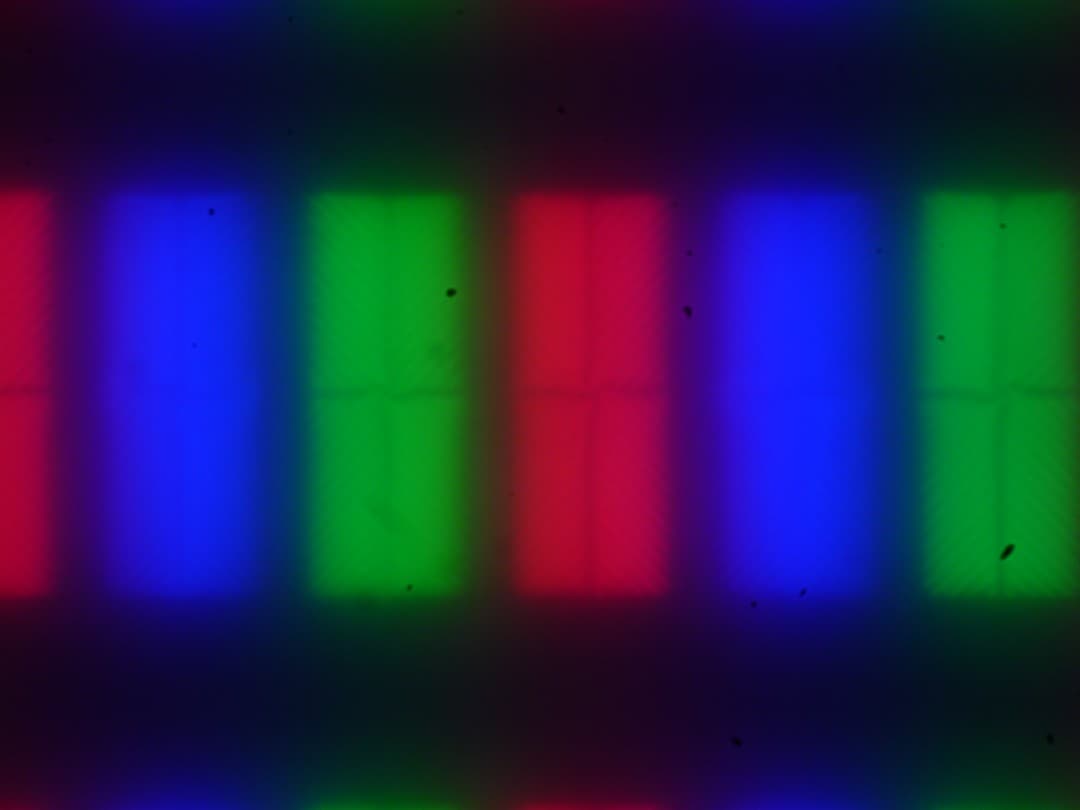 Четкое изображение структуры пикселей из-за матовой поверхности получить не удается, впрочем, на фрагменте ниже можно разглядеть типичную для VA структуру в виде параллельных полосок, а также что каждый субпиксель делится на четыре равных домена, в которых полоски ориентированы под разными углами (черные точки — это пыль на матрице фотоаппарата):