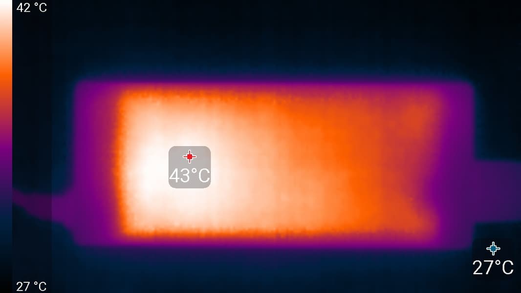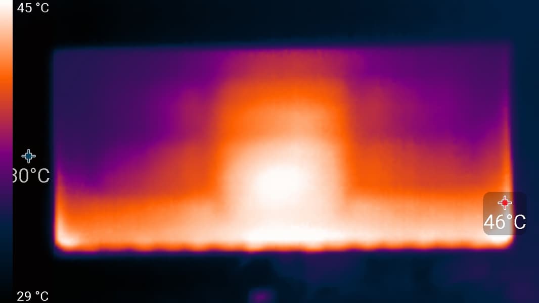 По распределению областей нагрева, можно предположить, что внизу находится светодиодная линейка подсветки экрана. Нагрев сзади умеренный. Корпус БП нагрелся всего до 43 °C, что немного: