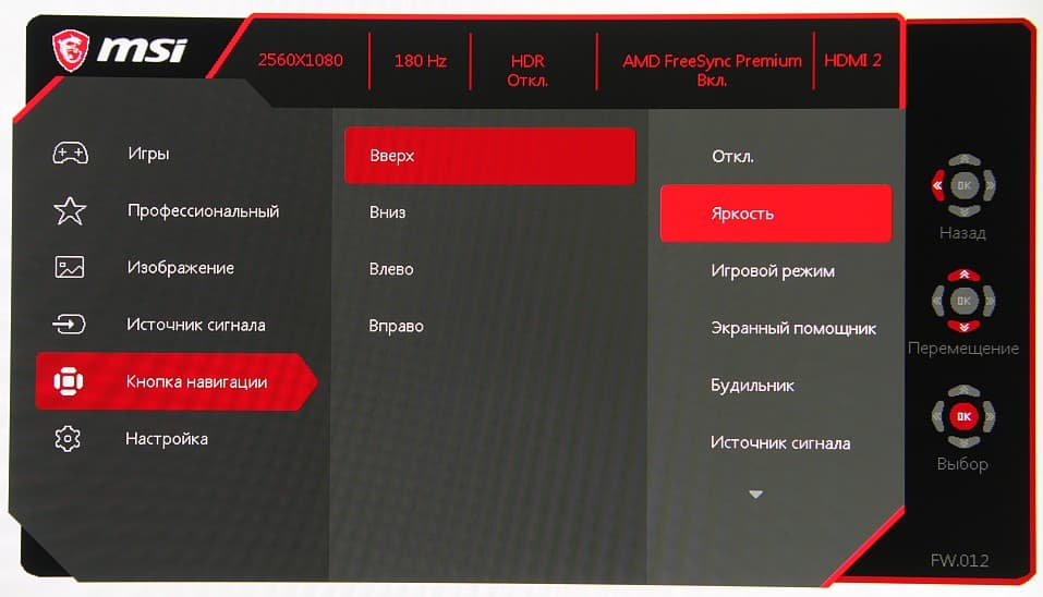 Навигация удобная, так как все делается только джойстиком, не нужно переносить палец на кнопки, к тому же списки зациклены. Единственно, для подтверждения установленного значения требуется нажатие на джойстик, что явно лишнее. При настройке изображения меню остается на экране — это несколько мешает оценке вносимых изменений.