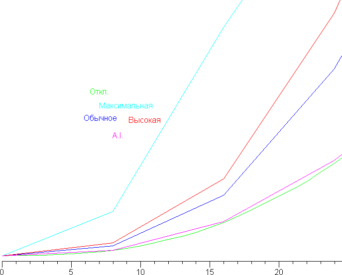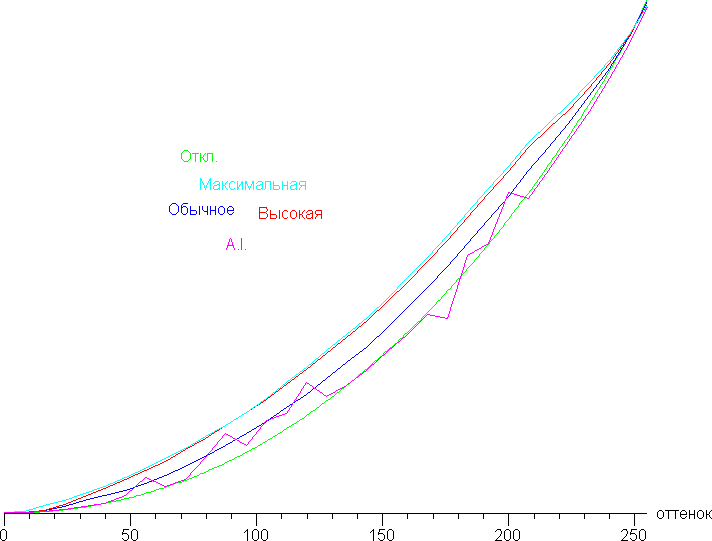 Видно, что меняется только скорость роста яркости в темной области, а уровень черного, а значит и контрастность не меняется, как и должно быть. Автоматический режим (A.I.), видимо, работает в динамике, потому и результат странный.