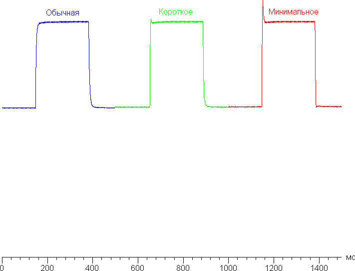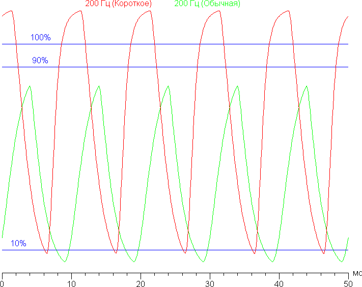 Приведем зависимости яркости (вертикальная ось) от времени (горизонтальная ось) при чередовании белого и черного кадра при 200 Гц кадровой частоты (первая и вторая ступень разгона, на третьей все также, как и на второй):