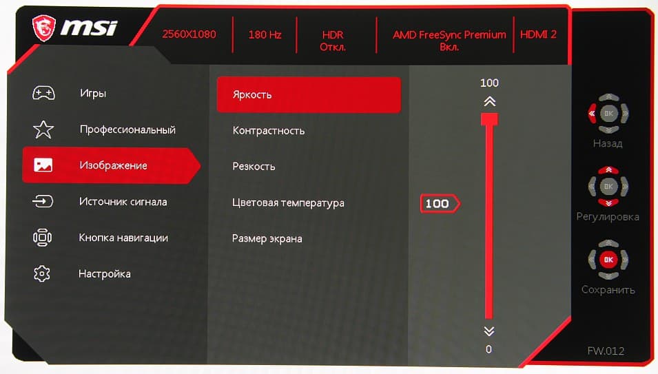 Настроек, влияющих на яркостный и цветовой баланс, не очень много, что для игрового монитора ожидаемо. Есть регулировки яркости (подсветки) и контрастности, краевой четкости (Резкость), подстрока различимости градаций в тенях, функции принудительного снижения интенсивности синей компоненты, включения динамической регулировки яркости подсветки и некая функция Улучшение изображения (ее заметный эффект — это агрессивное увеличение краевой четкости).