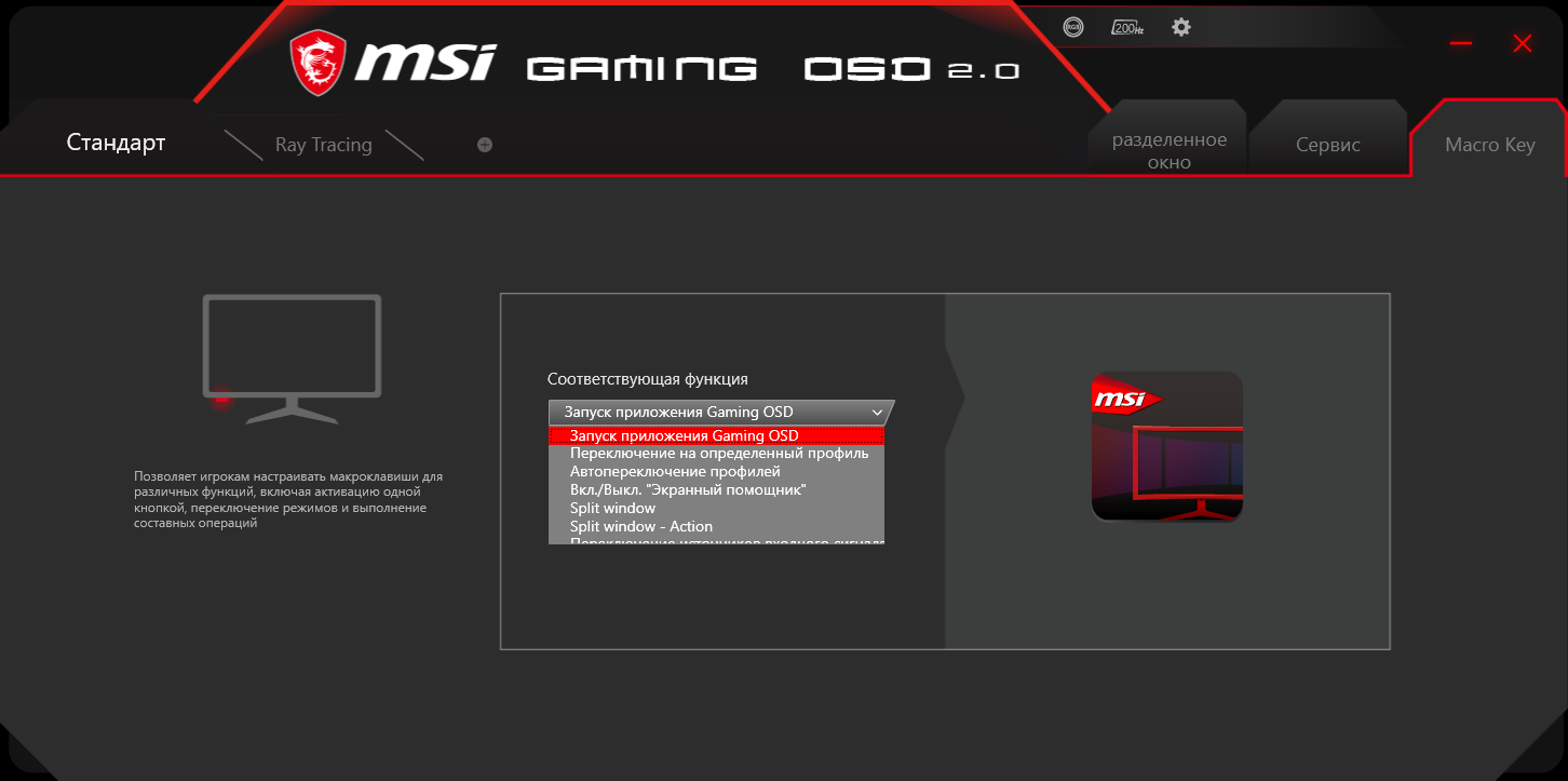 Кнопка слева работает совместно с программой Gaming OSD и по умолчанию нажатие на кнопку просто вызывает эту программу (если она была установлена), но можно назначить и другое действие, выбрав его в списке: