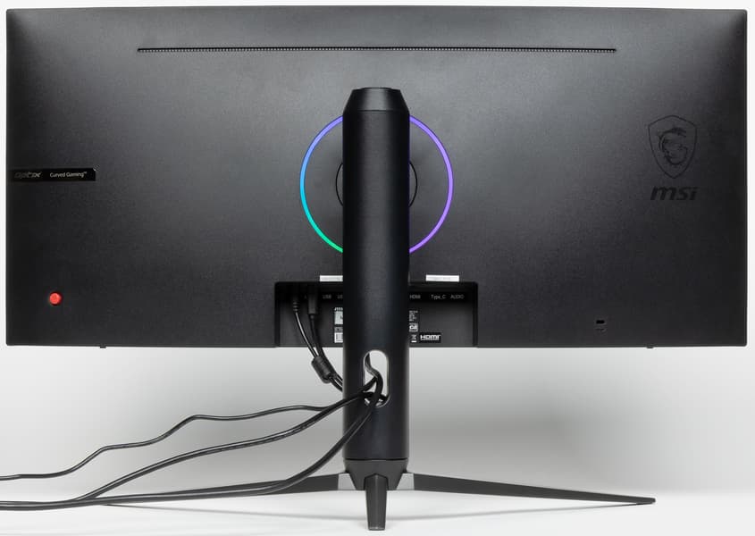Кабели, идущие от разъемов монитора, можно пропустить через отверстие в нижней части стойки подставки. Вокруг круглой крепежной площадки есть кольцевая вставка из прозрачного пластика, которая подсвечивается несколькими многоцветными адресуемыми светодиодами.