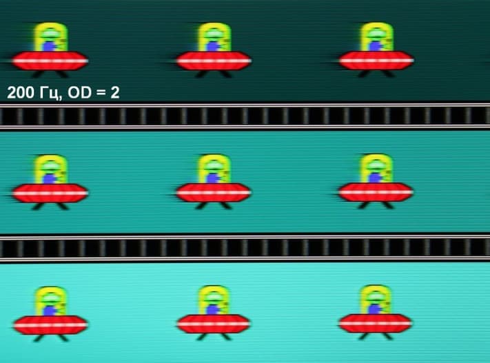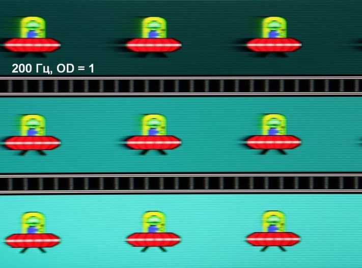 Видно, что при прочих равных условиях четкость изображения повышается по мере роста частоты обновления и степени разгона, но даже на максимальном разгоне артефакты не очень заметные. Включение вставки черного кадра увеличивает четкость, но за объектами в движении появляются контуры, что снижает положительный эффект.
