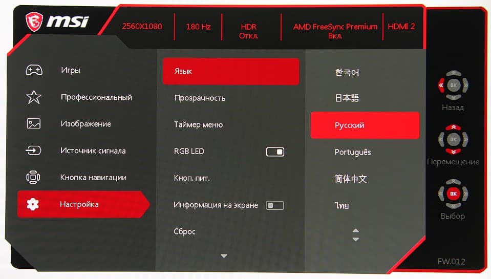 Настраиваются уровень прозрачности фона и задержка автоматического выхода из меню. Присутствует русская версия экранного меню.