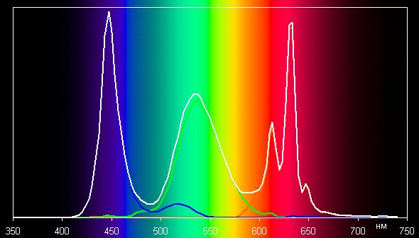 Ниже приведен спектр для белого поля (белая линия), наложенный на спектры красного, зеленого и синего полей (линии соответствующих цветов):