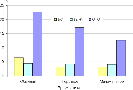 Время отклика зависит от значения одноименной настройки, которая управляет разгоном матрицы. График ниже показывает, как меняется время включения и выключения при переходе черный-белый-черный (столбики «вкл.» и «выкл.»), а также среднее суммарное время для переходов между полутонами (столбики «GTG») для трех значений этой настройки: