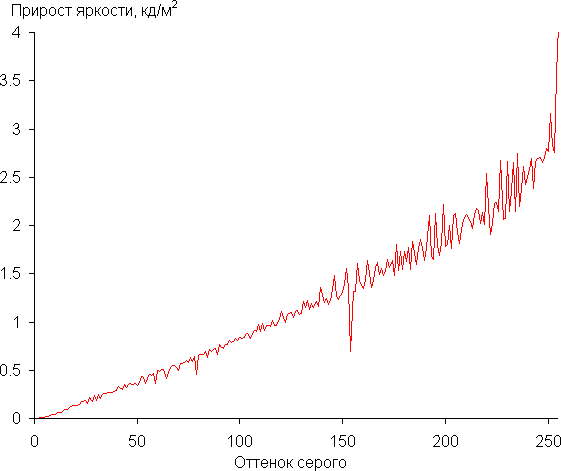 Для оценки характера роста яркости на шкале серого мы измерили яркость 256 оттенков серого (от 0, 0, 0 до 255, 255, 255). График ниже показывает прирост (не абсолютное значение!) яркости между соседними полутонами: