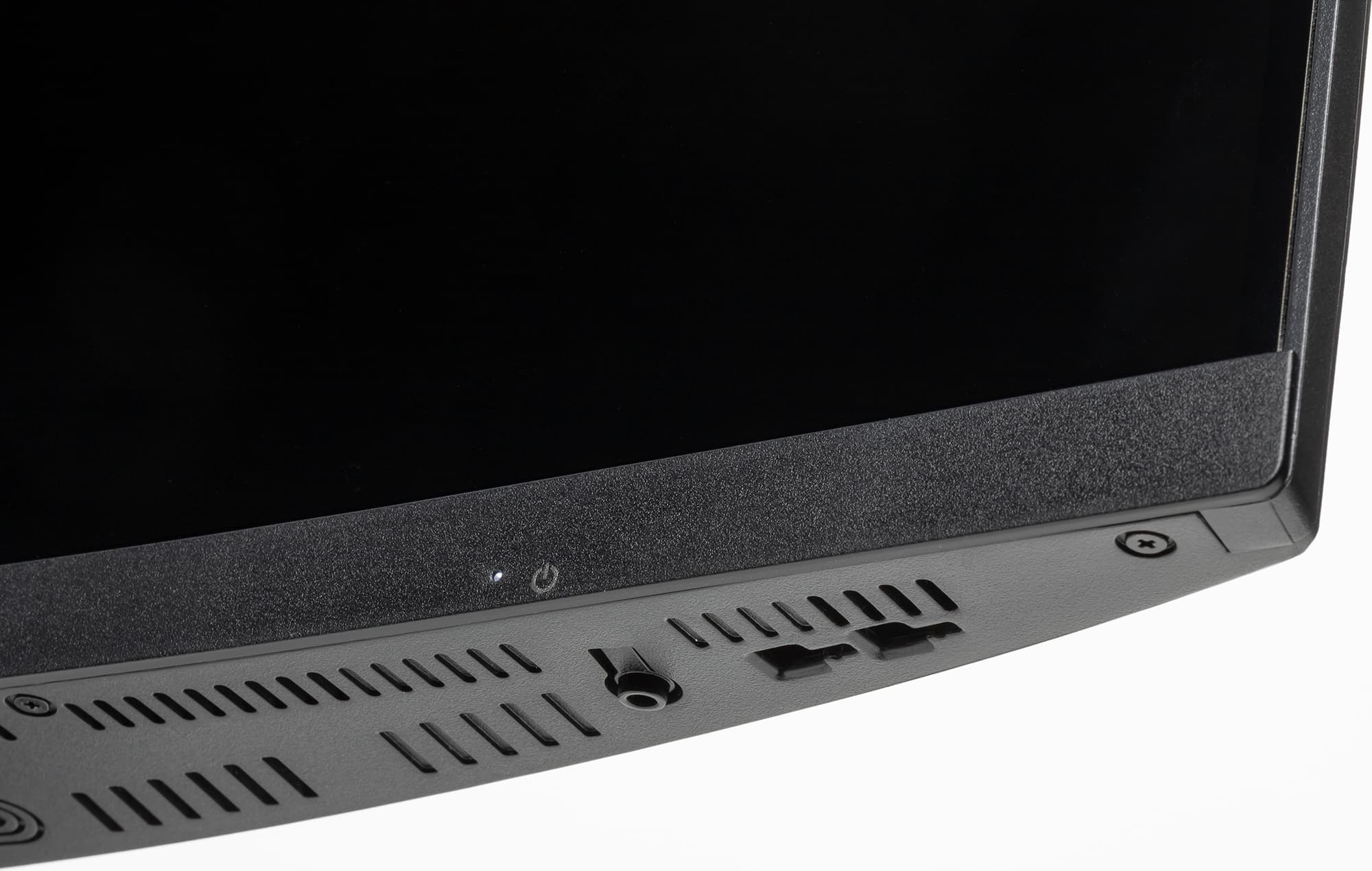 Кнопка справа выключает монитор или переводит его в странный (индикатор не горит, потребление 3,8 Вт) режим ожидания, что именно — указывает пользователь в настройках. Расположение кнопок обозначено значками на фронтальной планке. Рядом со значком справа есть крохотное отверстие, сквозь которое просвечивает индикатор состояния.