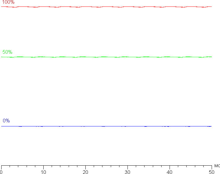 На любом уровне яркости модуляция подсветки отсутствует, что исключает видимое мерцание экрана. Для тех, кто привык распознавать знакомое сокращение, уточним: ШИМ отсутствует. В доказательство приведем графики зависимости яркости (вертикальная ось) от времени (горизонтальная ось) при различных значениях настройки яркости: