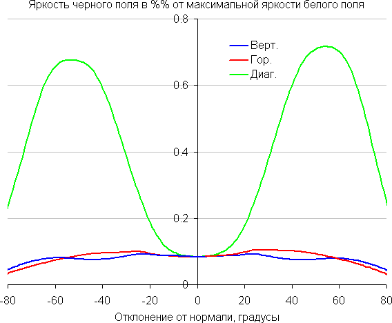Отметим плавное уменьшение яркости при отклонении от перпендикуляра к экрану в горизонтальном направлении, при этом графики не пересекаются во всем диапазоне измеряемых углов. Чуть быстрее падает яркость при отклонении в вертикальном направлении. При отклонении в диагональном направлении поведение яркости оттенков имеет промежуточный характер между вертикальным и горизонтальным направлениями, за исключением яркости черного поля, которая начинает резко возрастать уже при 20°-30° отклонения от перпендикуляра к экрану. Если сидеть от экрана на расстоянии 50-60 см, то черное поле по углам будет заметно светлее, чем в центре. Контрастность в диапазоне углов ±82° в случае отклонения по диагонали приближается к отметке 10:1, но не опускается ниже.
