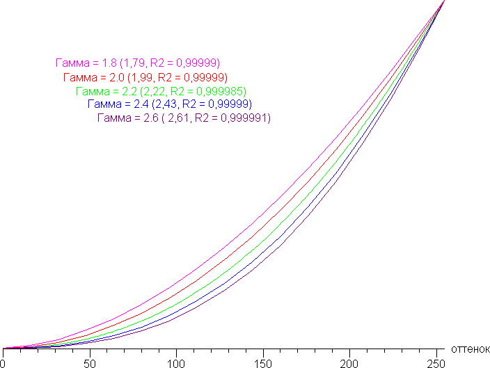 Реальная гамма-кривая зависит от выбранного профиля в списке Гамма (значения показателей аппроксимирующей функции приведены в скобках в подписях, там же — коэффициент детерминации):