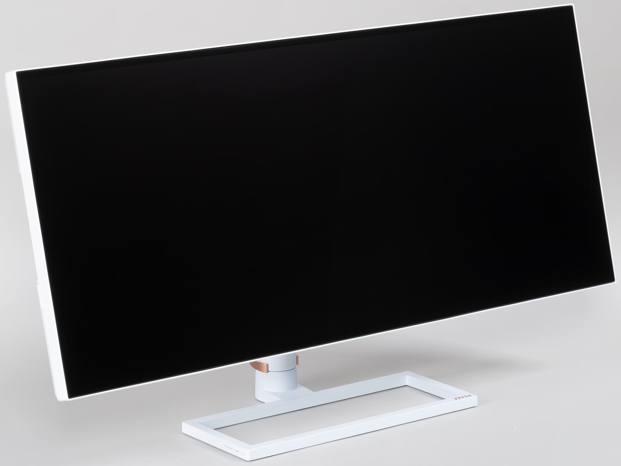 При типичной посадке пользователь индикатор не видит, видно только свет, отраженный от плоскости стола. Обрамление блока экрана, задняя панель и кожухи подставки изготовлены из пластика с белым матовым покрытием. Задняя панель имеет слегка асимметричный вид, а две темные вставки на задней панели символизируют мазки кисти — круг и слегка изогнутую линию. Нишу с разъемами можно прикрыть декоративной крышкой, которая крепится на пластиковых защелках, а отходящие кабели собрать в аккуратный пучок и прижать к стойке подставки, воспользовавшись входящим в комплект кабельным зажимом. Дополнительно кабели фиксируются вторым кабельным зажимом, находящимся в нише с разъемами. В итоге сзади монитор выглядит очень аккуратно.
