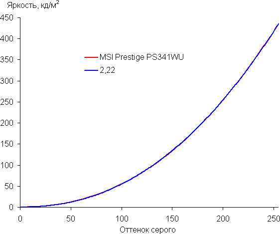 Аппроксимация (уже по 256 точкам) полученной гамма-кривой дала показатель 2,22, что чуть-чуть выше стандартного значения 2,2, при этом реальная гамма-кривая почти не отклоняется от аппроксимирующей степенной функции:
