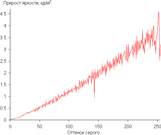 Реальная гамма-кривая ближе всего к стандартной при выборе Гамма = 2.2, поэтому далее мы измерили яркость 256 оттенков серого (от 0, 0, 0 до 255, 255, 255) при этом значении. График ниже показывает прирост (не абсолютное значение!) яркости между соседними полутонами: