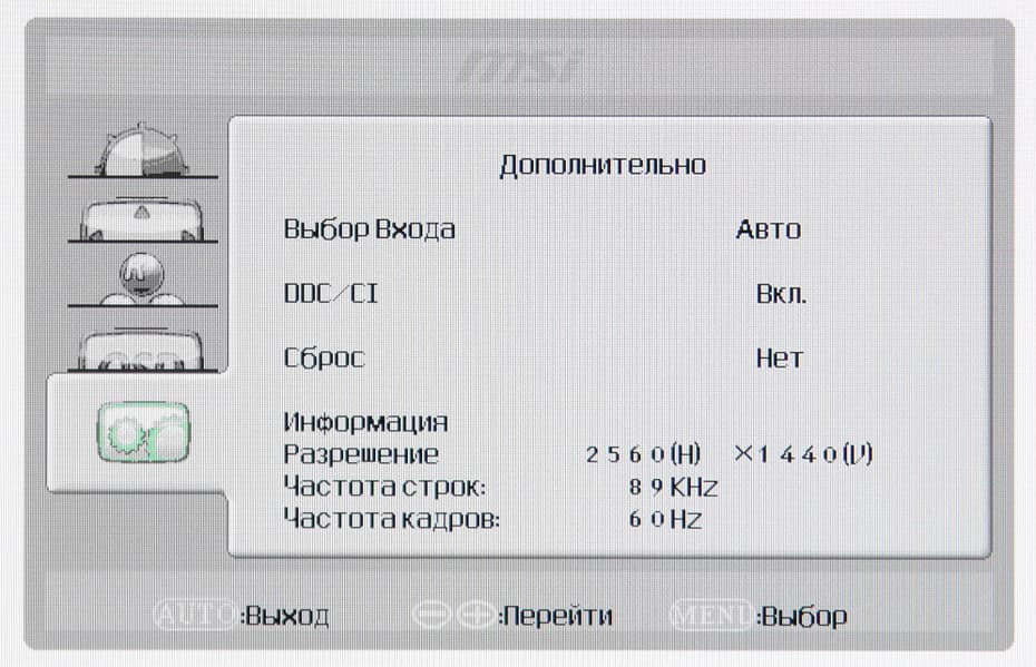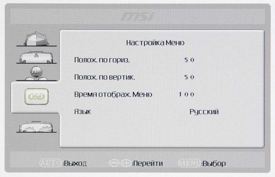 Индикатор питания при работе неярко светится синим, в режиме ожидания — оранжевым и не горит, если монитор условно (механического выключателя питания, к сожалению, нет) выключен. Когда на экране нет меню, то при первом нажатии на первую (если сверху вниз) кнопку выводится меню выбора входа, на вторую — окошко с бегунком громкости, на третью — список с выбором профиля яркости, на четвертую — главное меню с настройками. Меню достаточно крупное, надписи читаемые. Навигация в принципе удобная (но неудобны сами кнопки), списки зациклены, запоминается последняя страница, к которой обращался пользователь. При настройке изображения меню остается на экране, что немного мешает оценке вносимых изменений. При необходимости можно поменять положение меню на экране и выбрать тайм-аут автоматического выхода из меню. Есть русская версия экранного меню. Кириллический шрифт меню слегка кривоват, качество перевода на русский язык приемлемое, ошибок немного.