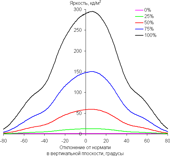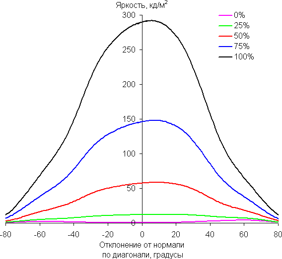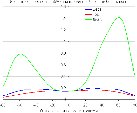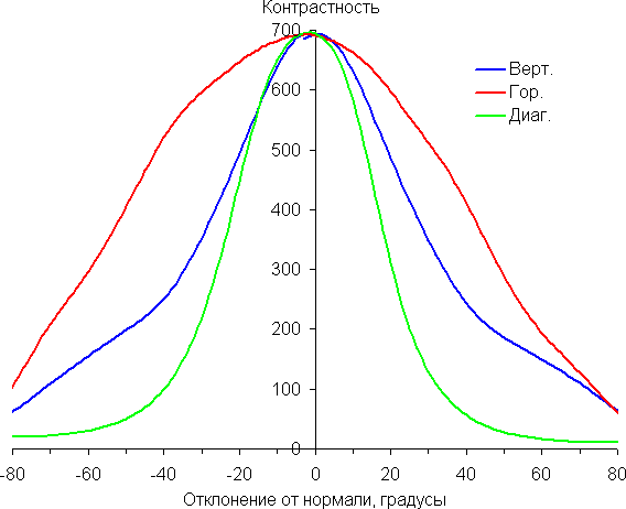 Отметим медленное уменьшение яркости при отклонении от перпендикуляра к экрану в горизонтальном направлении в довольно широком диапазоне углов, при этом графики не пересекаются во всем диапазоне измеряемых углов. Заметно быстрее падает яркость при отклонении в вертикальном направлении. При отклонении в диагональном направлении поведение яркости оттенков имеет промежуточный характер между вертикальным и горизонтальным направлениями, за исключением яркости черного поля, которая начинает резко возрастать уже при 20°-30° отклонения от перпендикуляра к экрану. Если сидеть от экрана на расстоянии 50-60 см, то черное поле по углам будет заметно светлее, чем в центре. Контрастность в диапазоне углов ±82° в случае отклонения по диагонали приближается к отметке 10:1, но все же не опускается ниже.