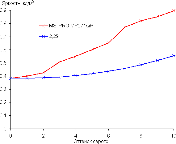 Рост прироста яркости более-менее равномерный, и каждый следующий оттенок значимо ярче предыдущего, даже в самой темной области: