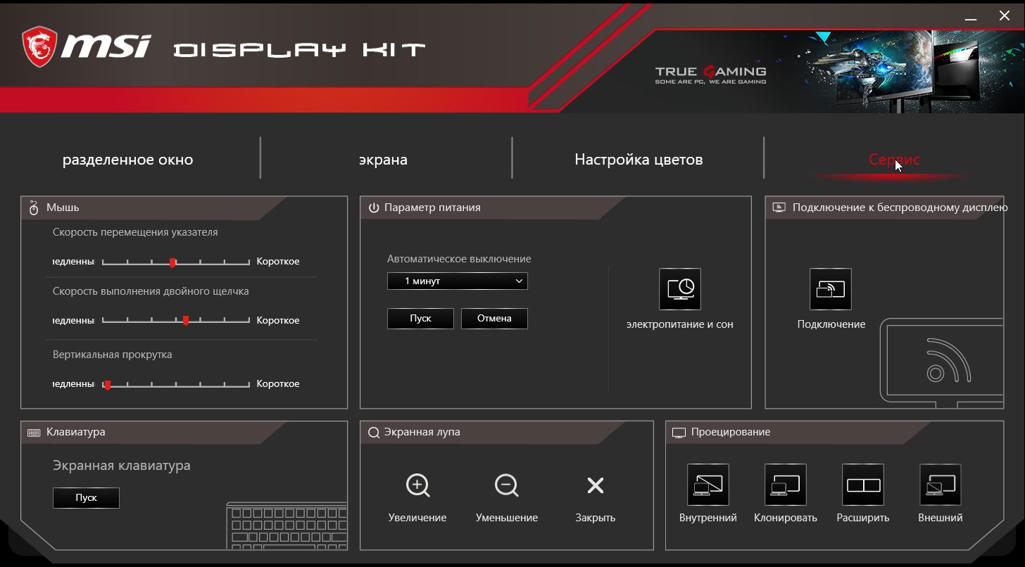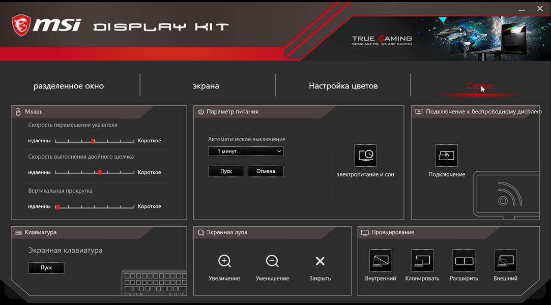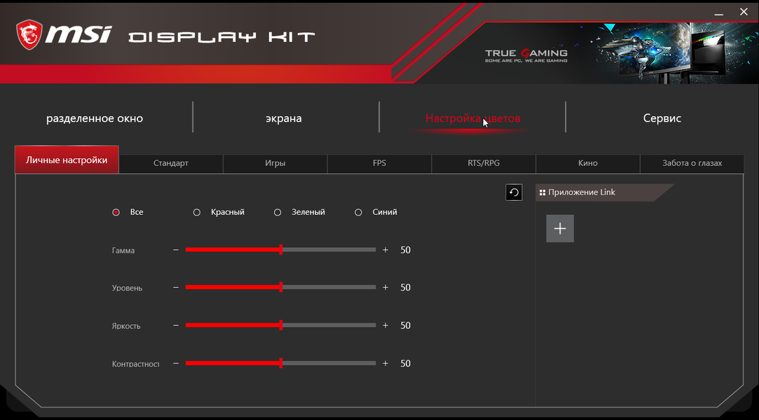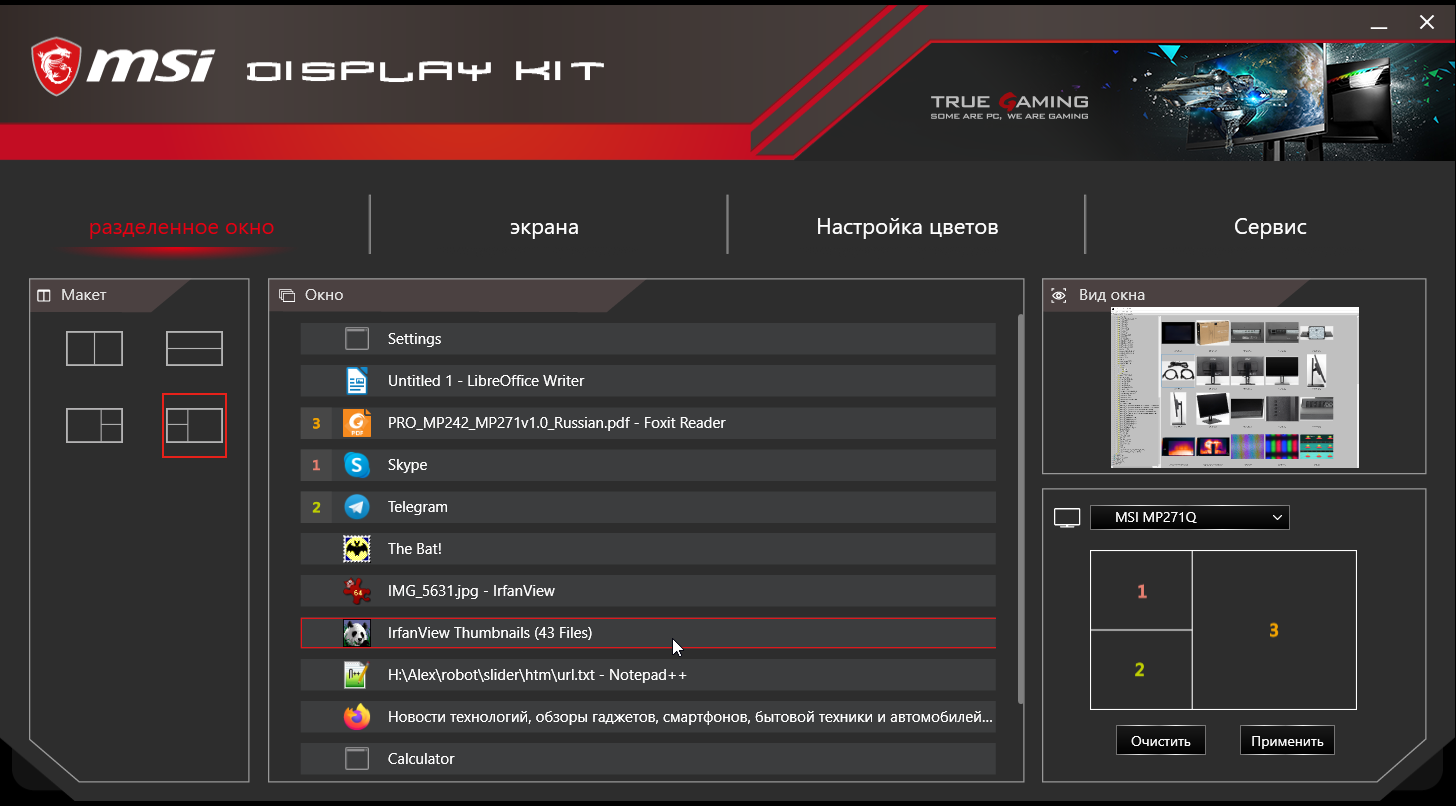 Напечатанной документации в комплекте поставки — самый минимум, так как полные руководства пользователя на нескольких языках (включая на русский) в виде PDF-файлов доступны на сайте компании. Там же можно найти программу Display Kit. Она позволяет с компьютера изменять некоторые настройки монитора, также есть возможность включить автоматический выбор профиля в зависимости от активного приложения. Кроме того, в MSI Display Kit есть функция, упрощающая распределение окон на рабочем столе. Для данного разрешения это уже весьма актуально. Дополнительно можно поменять некоторые системные настройки.